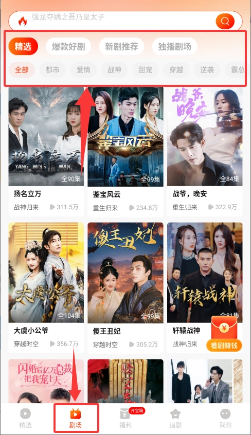 2、进入剧场板块后,可从精选推荐或热门分类里挑选自己感兴趣的短剧。