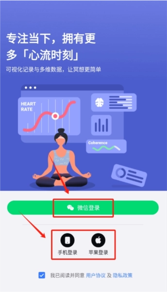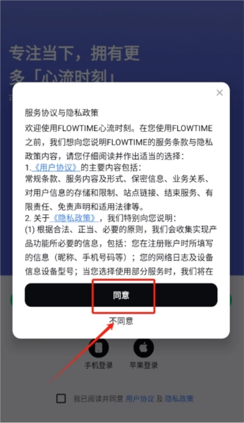 1打开心流时刻后,界面会显示软件协议内容,建议仔细阅读,确认无疑问后点击同意,即可进入登录页面,为后续操作做准备。