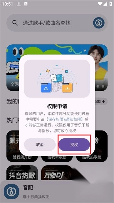1、打开音配音乐软件,点击授予储存和通知权限。