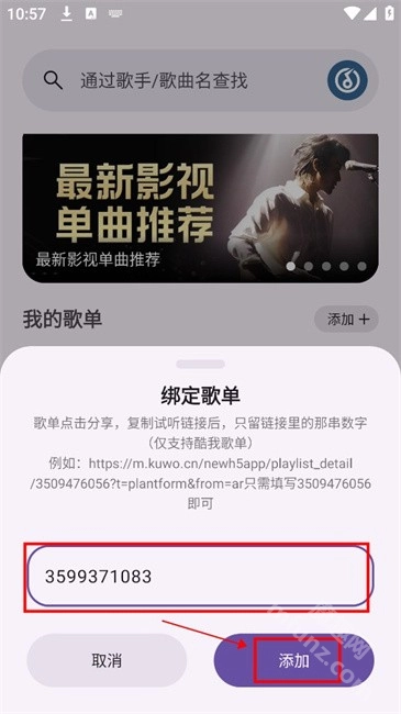 4、输入歌单id,点击“添加”。