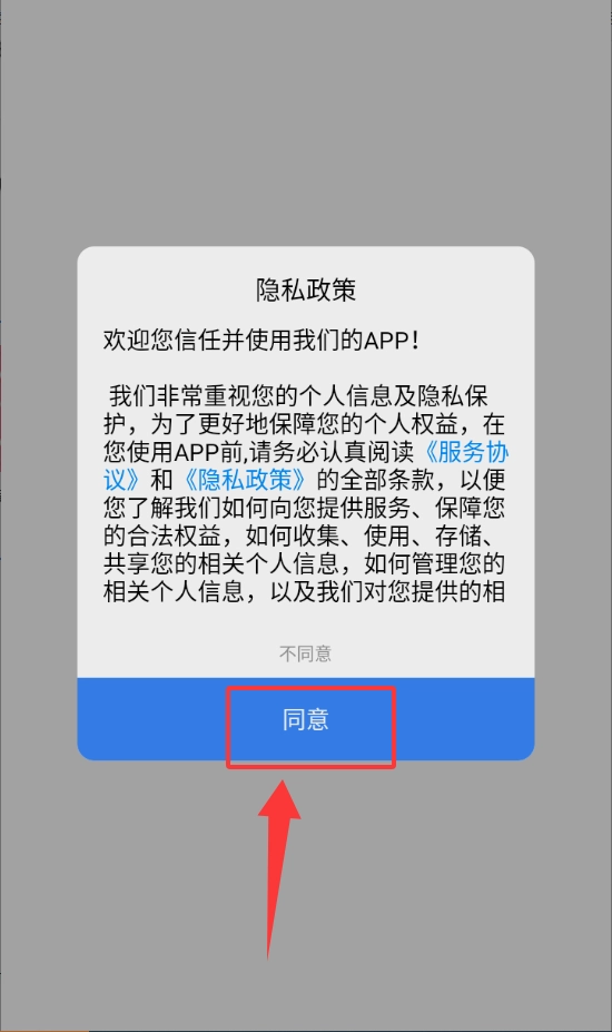 1、启动应用后阅读隐私政策,确认后点击同意按钮进入主页面。