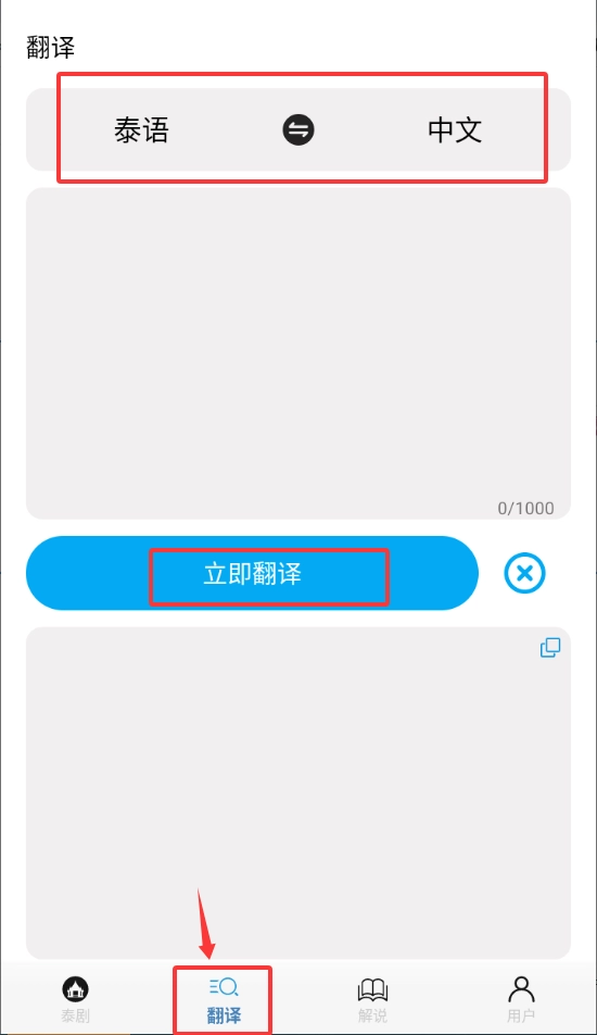 3、切换至翻译页面输入泰文内容,选择中文翻译并获取对应结果。