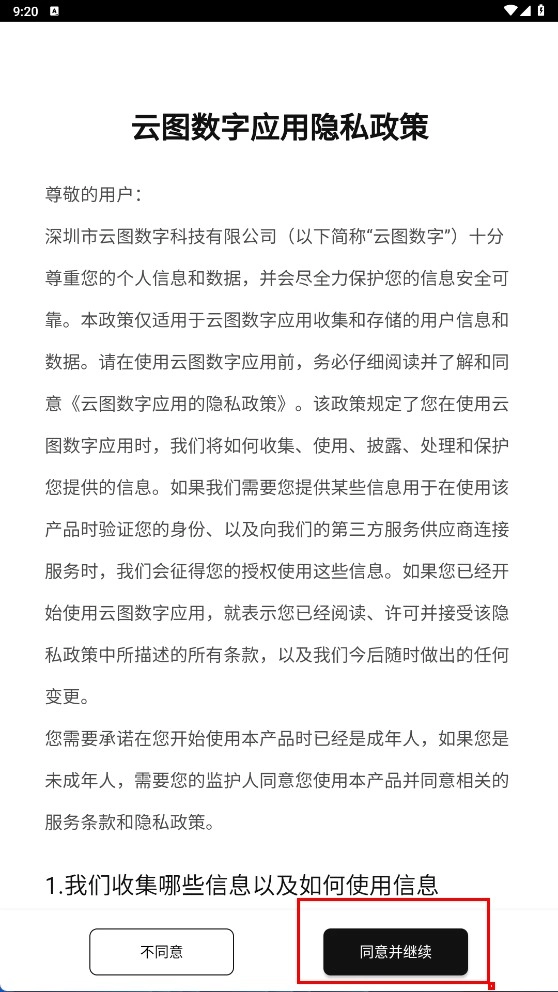 首次打开应用时,需先阅读《云图数字应用隐私政策》,之后点击【同意并继续】按钮以确认接受隐私条款,随后即可进入应用。
