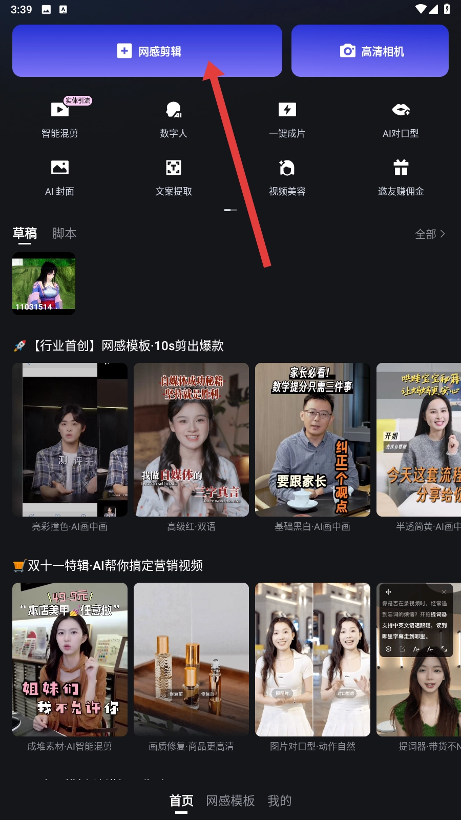 1、点击【网感剪辑】,导入需编辑的视频,进入剪辑界面,为删除片段做好准备呢。