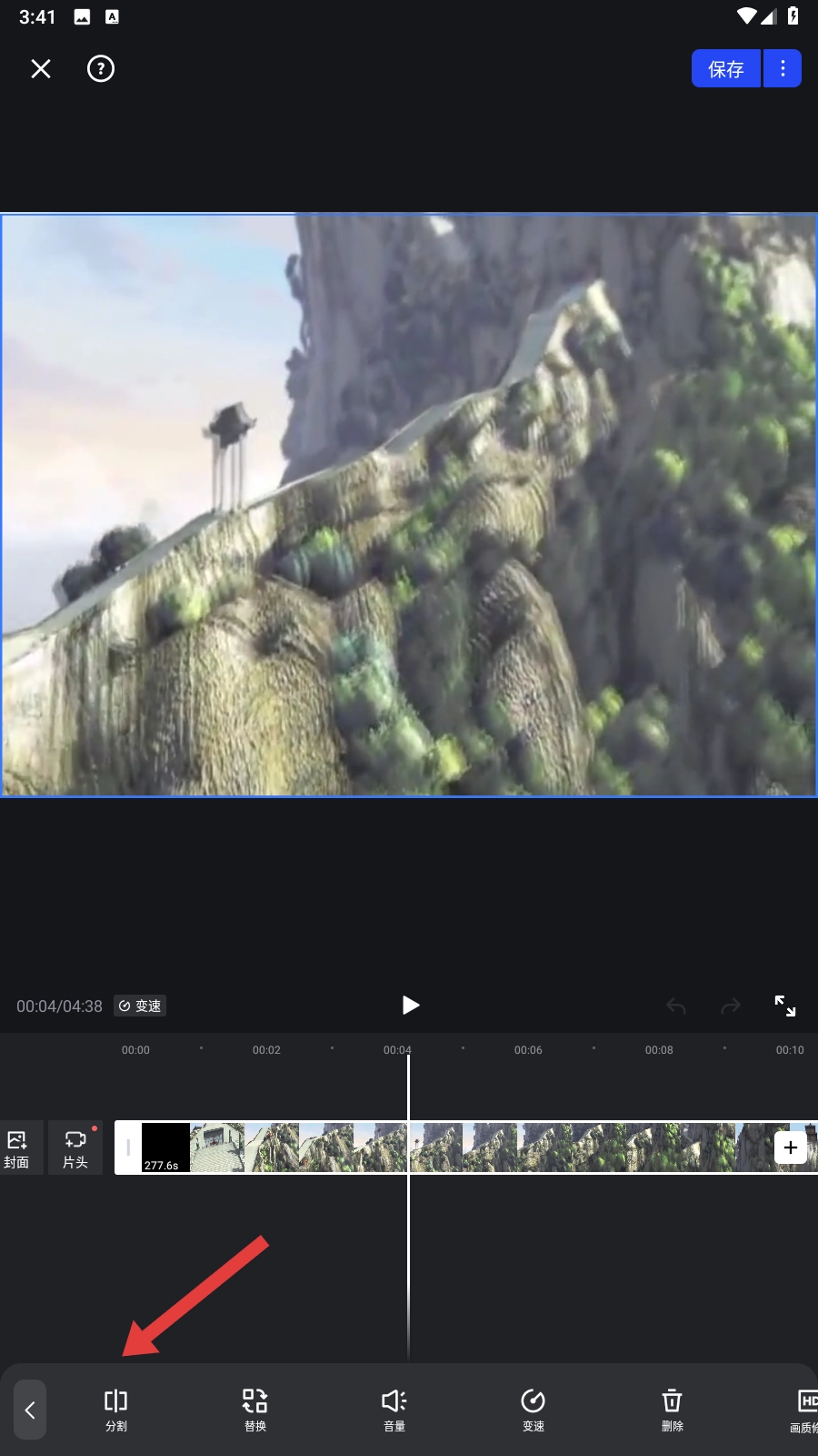 3、在剪辑界面,点击【分割】功能,将视频分成多段,便于后续删除操作哦。