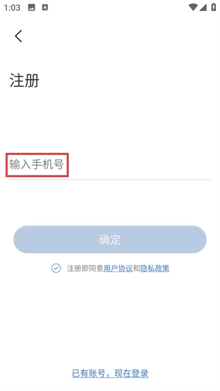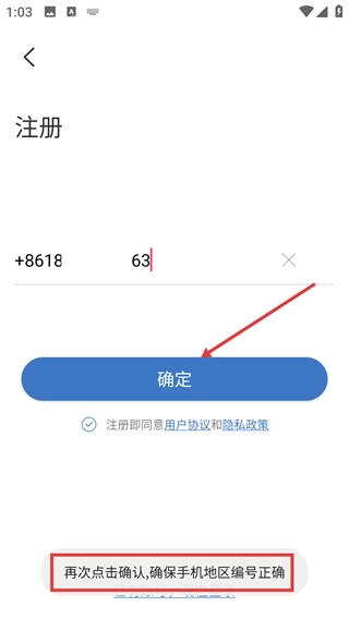 2、在注册页面的输入框内填写指定的手机号码,以激活后续可操作的【确定】按钮。