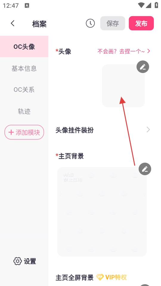 4、在OC档案编辑页面完成头像等信息的设置后,点击“保存”或“发布”按钮,即可完成OC的创建与发布操作。