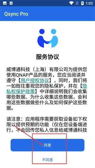 1、启动【Qsync-Pro】后,需仔细阅读【服务协议】和【用户授权协议】,确认无误后点击【同意】按钮,就能进入下一步操作流程。
