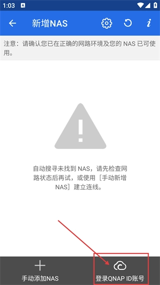 3、在【新增NAS】页面,若自动搜寻未找到NAS,可检查网络,或点击【登录QNAP-ID账号】来建立连线。