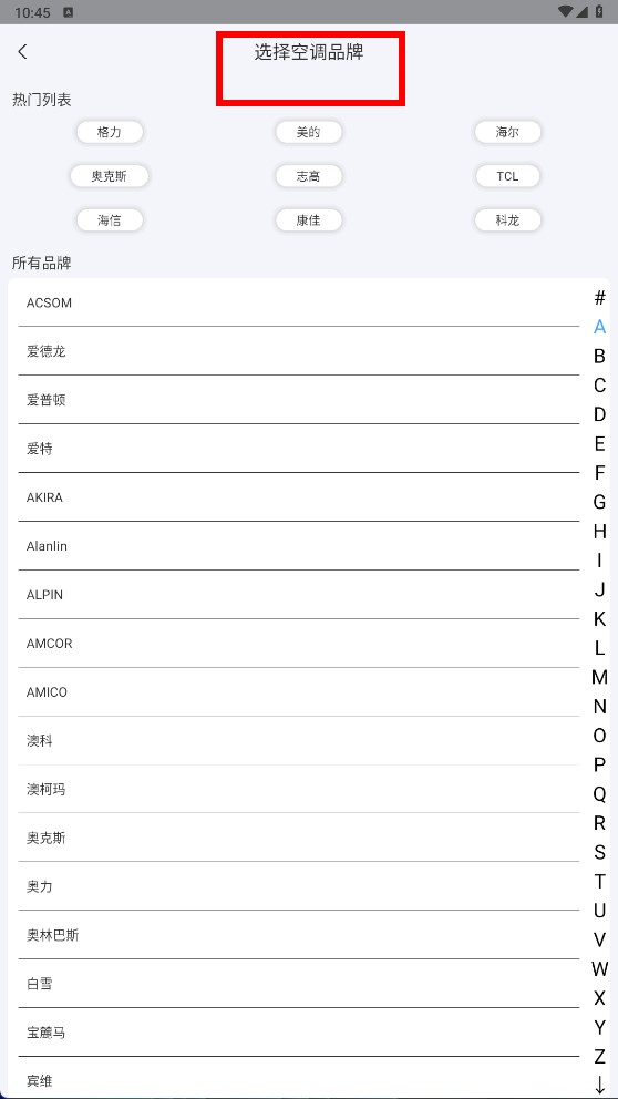 2、在品牌选择页面,可从热门品牌列表(例如格力、美的)或者所有品牌中,挑选对应的空调品牌。