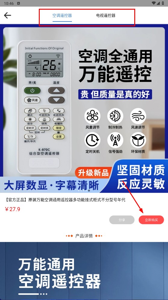 4、要是需要实体遥控器,可以在应用里点击【立即购买】,就能得到空调全通用的万能遥控设备。