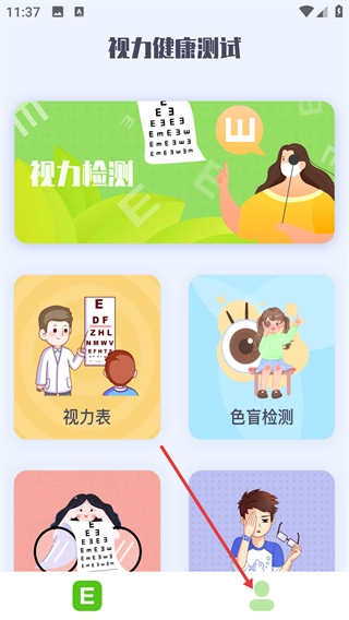 1、在【视力健康测试】的主界面,点击底部的功能按钮,即可进入涵盖客服、设置等选项的个人页面。