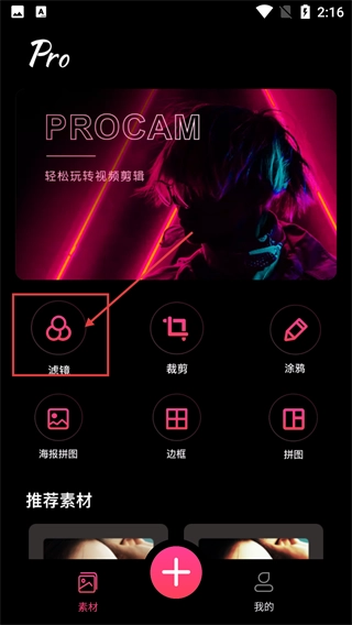 1、打开【PROCAM】的主界面后,点击功能栏里的【滤镜】按钮,就能进入滤镜选择页面,着手对素材的风格进行调整。