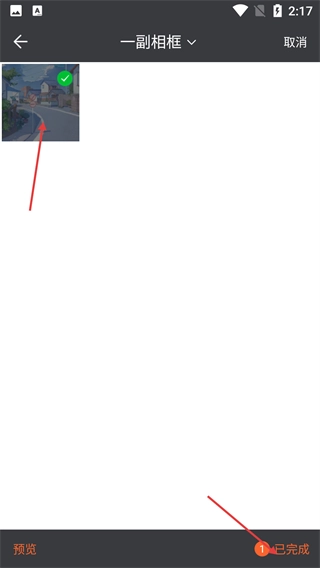 2、在【一副相框】页面选中目标素材后,页面底部会出现【已完成】的提示,这意味着素材已成功选定,接下来可以进入后续的编辑流程。