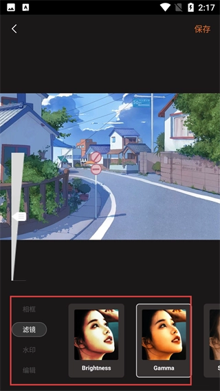 3、进入滤镜编辑界面后,能选择【Brightness】-【Gamma】这类滤镜效果,实时查看调整后素材的显示效果,根据需求切换不同风格。