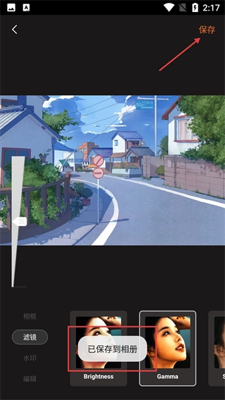 4、完成滤镜调整后,点击页面右上角的【保存】按钮,素材会自动存入相册,此时页面还会弹出【已保存到相册】的提示。