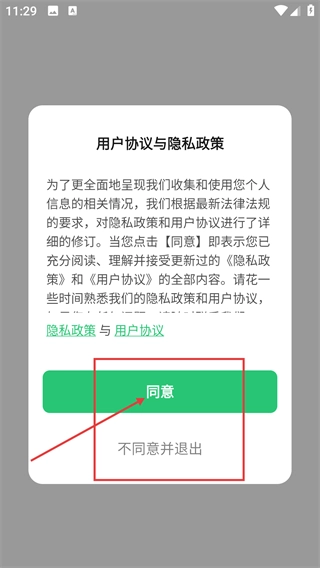 1、在【用户协议与隐私政策】界面,仔细阅读修订后的【《隐私政策》】,点击【同意】按钮后,就能继续使用应用提供的服务。