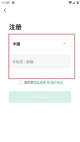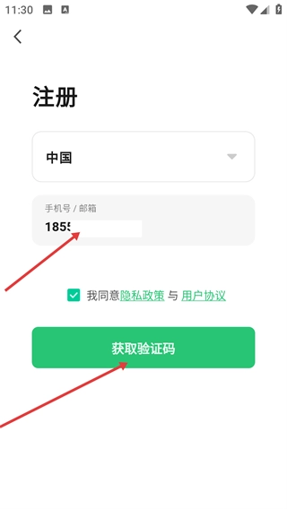 4、在【注册】页面,填写手机号并勾选协议同意选项后,点击【获取验证码】按钮,就能获取验证信息来完成注册流程。