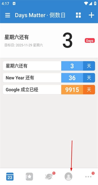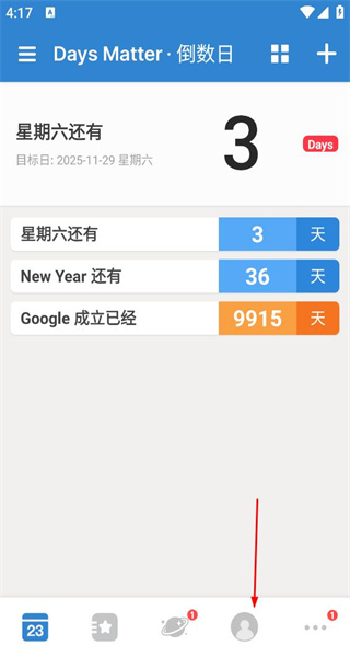 打开软件进入主界面后,能看到多个倒数计时事项,每个事项都显示着距离对应日期的剩余天数,点击底部的选项即可进入个人相关页面。