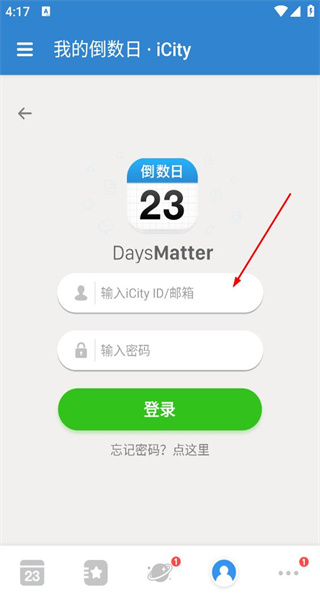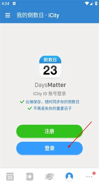 2、进入我的倒数日页面后,找到注册与登录按钮,点击登录按钮,进入相应的登录信息填写界面以推进后续流程。