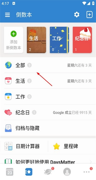 4、登录后进入倒数本页面,能看到生活、工作等分类,也有添加新倒数本的选项,可对倒数事项开展分类管理。