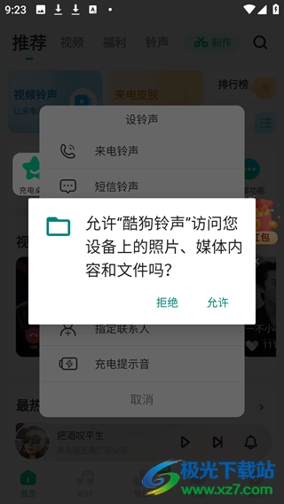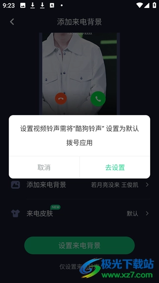 6、若想要设置来电背景,需先将“酷狗铃声”设为默认拨号应用,之后才能进行视频铃声的设置。