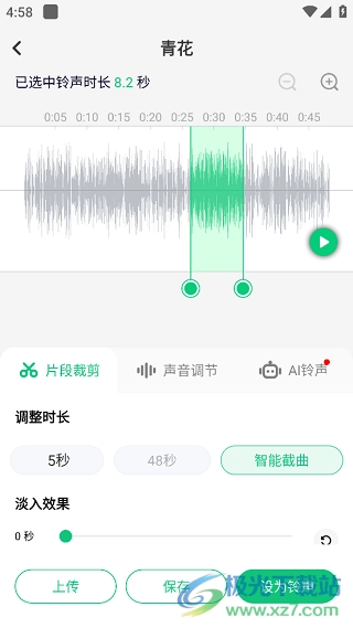 4、最后进入新界面后,就能依据自身需求,对音乐片段进行裁剪、调节声音大小、调整时长,之后点击右下角的“设为铃声”按钮即可。