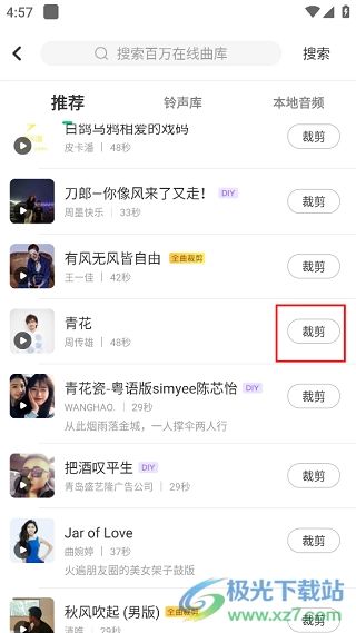 3、接着在弹出的窗口里,有影视综艺、纯音乐、DJ舞曲等各类音乐资源可供选择,找到你喜爱的歌曲后,点击它右侧的“裁剪”按钮即可。