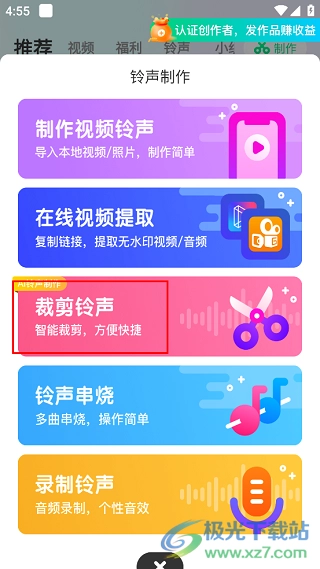 2、此时下方会弹出一个选项框,里面提供了众多可免费选择的功能,这里我们以“裁剪铃声”为例,点击该选项即可。