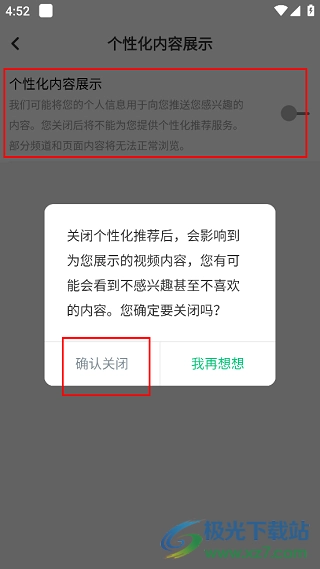 5、最后进入新页面后,找到“个性化内容展示”选项,将其右侧的开关按钮关闭,此时会弹出提示窗口,点击窗口中的“确认关闭”即可完成操作。