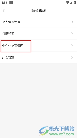 4、接着在弹出的新窗口里,点击里面的“个性化推荐管理”选项。
