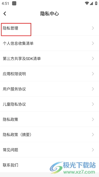 3、接下来会进入新的界面,在选项列表里找到“隐私管理”并点击。