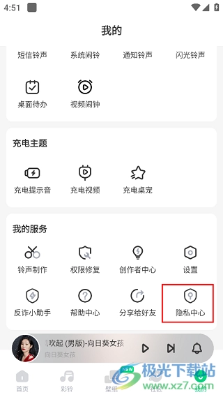 2、进入个人中心界面后,这里有来电功能、手机美化、提醒服务、充电主题、我的服务等多种功能选项,点击其中的“隐私中心”。