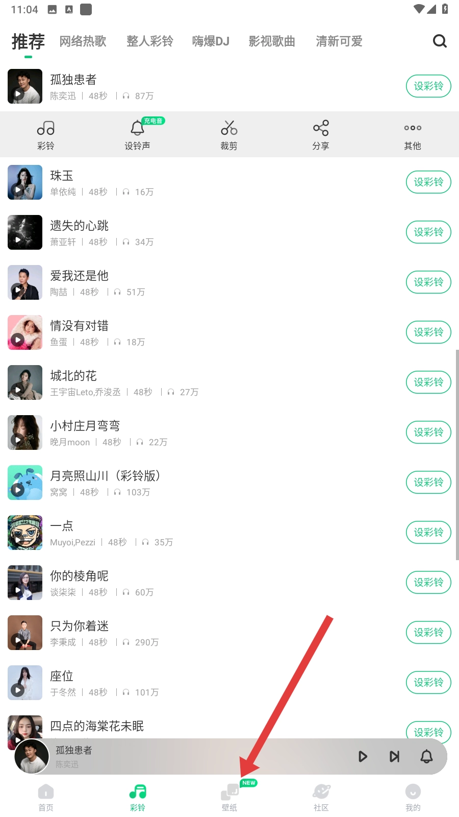 进入后能看到不少热门歌曲,也能搜索自己喜欢的歌曲来设置铃声。点击歌曲右侧的三个点就能进行相关操作,再点击“设置铃声”选项即可完成设置。