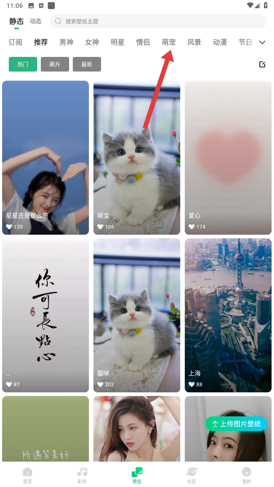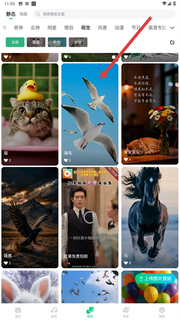 2、进入壁纸页面后,你可以点击【萌宠】这类分类标签,挑选自己感兴趣的壁纸类型,这样能帮你缩小选择范围~