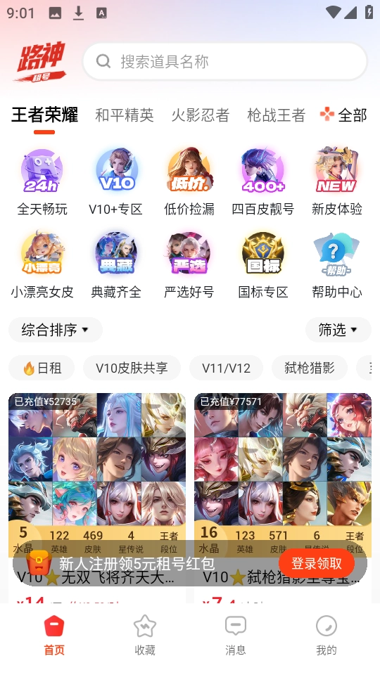 路神租号平台,整合了大量当下热门游戏的丰富账号资源。新用户完成注册登录操作后,就能领取租号红包福利。平台支持用户依据价格范围、起租时长、段位等级、英雄皮肤拥有量、英雄类型以及道具名称等多种筛选条件,快速找到符合心意的游戏账号。