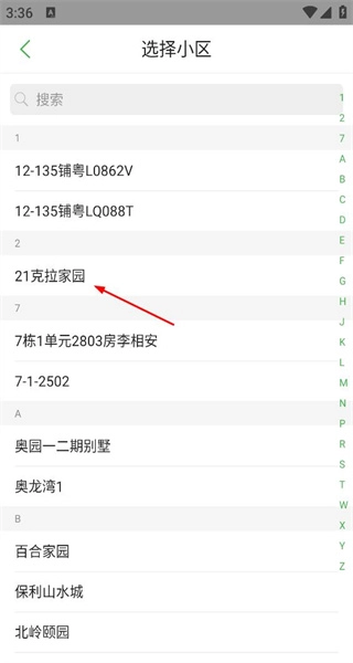 4、登录系统后跳转至小区选择界面,界面上展示有若干小区选项,从中找到“21克拉家园”并点击选定,以此推进与该小区相关联的后续流程。