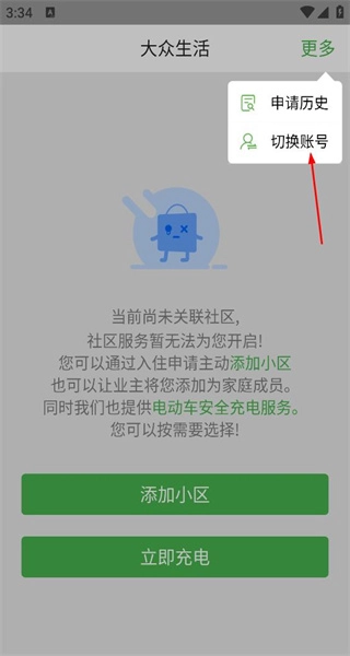 打开软件后,进入大众生活主界面,看到提示显示尚未关联社区,接着点击页面上的更多选项。