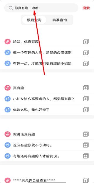 3、把对方发来的文字复制粘贴到搜索框里进行查询,之后就能得到有趣又合适的回复内容,再把回复复制发送给对方,这样就完成互动了。