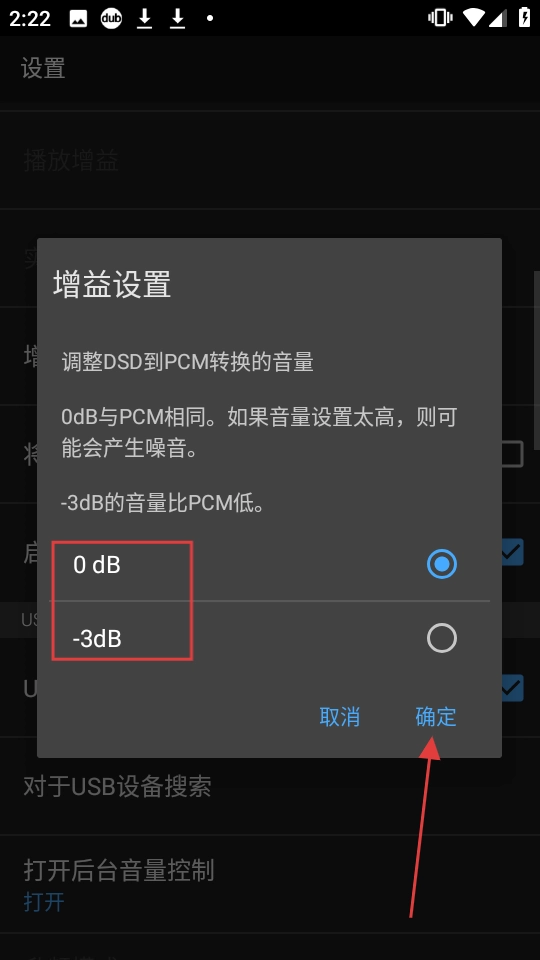 4、打开增益设置弹窗后,从中选择【0dB】或【-3dB】这两个选项之一,再点击【确定】按钮,即可完成相关设置。