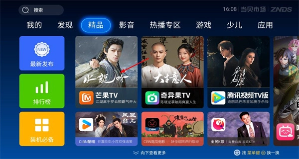 打开软件后,进入精品分类页面,这里能看到芒果TV等平台的内容,你可以浏览这些精品类的资源内容。