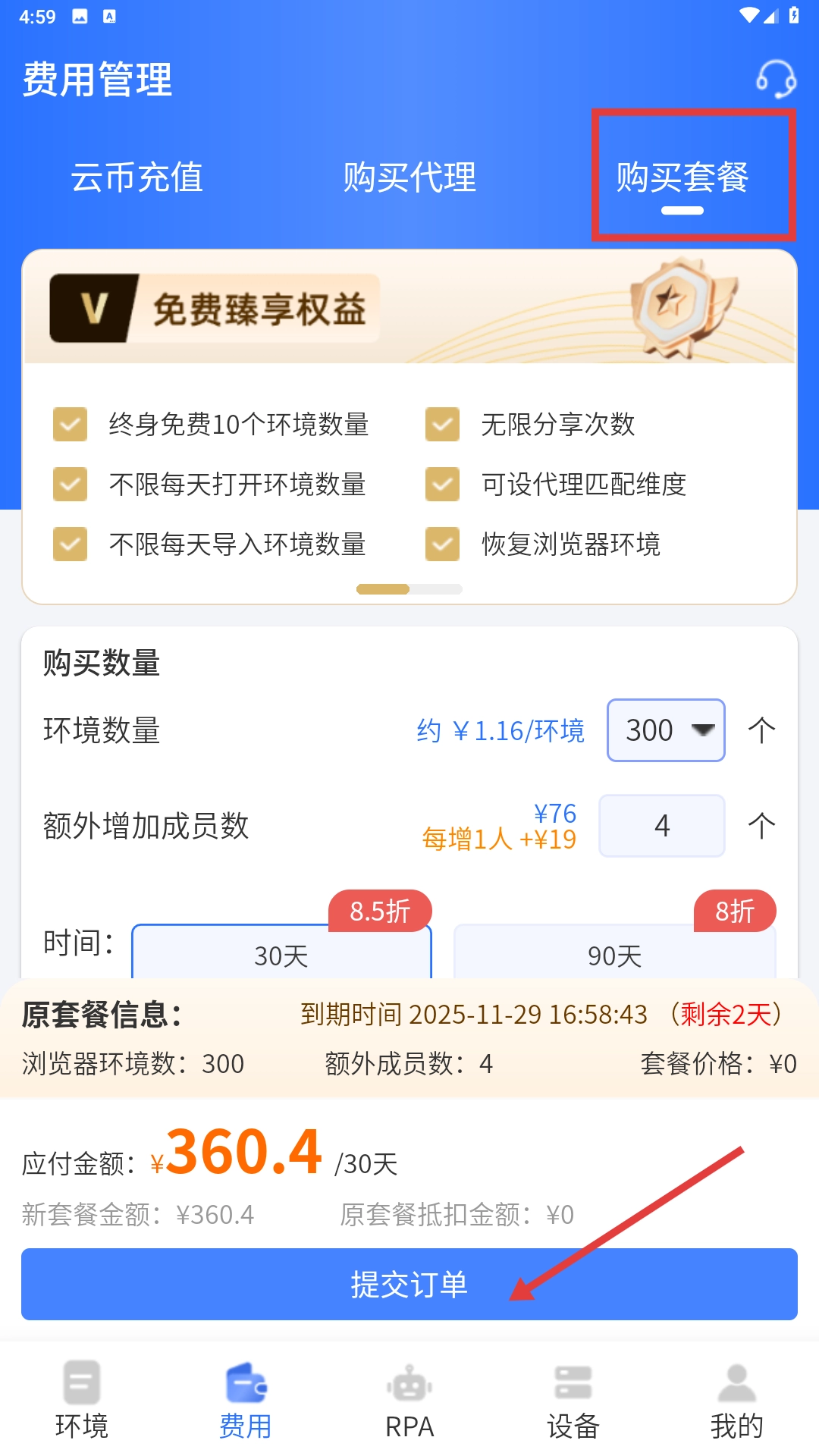 3、切换到购买套餐模块,选择数量、时间后,点击【提交订单-按钮】完成套餐购买。