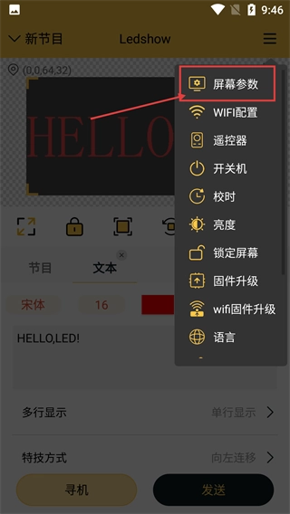 3、点击右上角菜单按钮,在展开的选项中选择【屏幕参数】,可配置LED屏的相关参数,同时还能进行【WIFI配置】【校时】等操作。