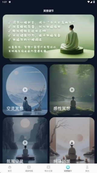 4、在冥想调节页面,可以体验更多不同冥想方式,放空自己,舒缓心情。