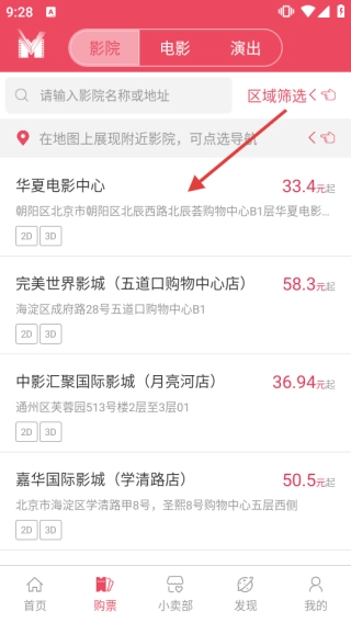 2、选定城市后,进入【影院】页面,查看【华夏电影中心】【完美世界影城】等影院的相关信息,点击想要前往的影院名称。