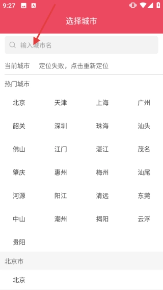 1、打开应用进入【选择城市】界面,可点击搜索框【输入城市名】搜索目标城市,也能直接从【热门城市】列表里选择目标城市。
