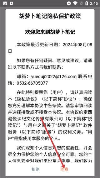 在胡萝卜笔记弹出的隐私保护政策窗口里,仔细阅读条款内容后,点击【同意】按钮,即可继续进行应用的使用流程。
