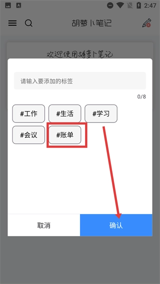 4、进入标签选择界面后,找到并选定你想要的目标标签(例如“#账单”),接着点击【确认】按钮,这样就能完成这条笔记的标签设置了。