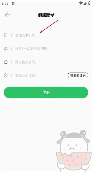4、进入账号创建页面后,填写手机号,设置并确认符合要求的密码,获取验证码并填入,最后点击注册按钮完成账号创建。