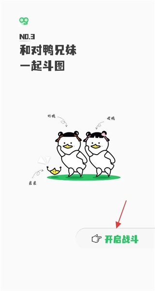 1、打开对鸭表情包制作应用,进入与对鸭兄妹一同斗图的界面后,找到页面下方的“开启战斗”按钮,点击该按钮即可进入软件的主操作页面。